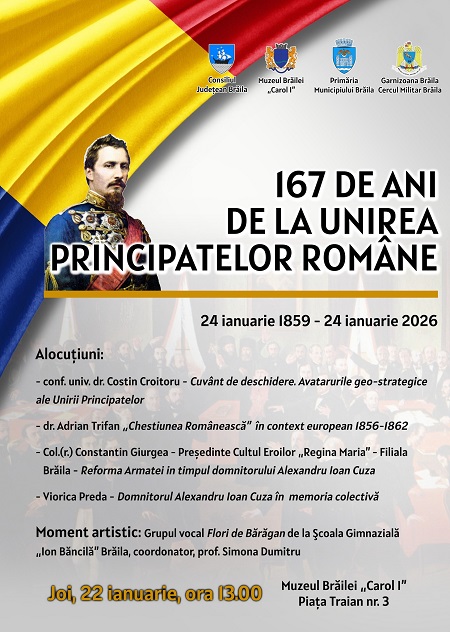 Muzeul Brăilei „Carol I” organizează joi, 22 ianuarie, un eveniment aniversar dedicat împlinirii a 167 de ani de la Unirea Principatelor Române (24 ianuarie 1859 – 24 ianuarie 2026), unul dintre cele mai importante momente din istoria modernă a României.