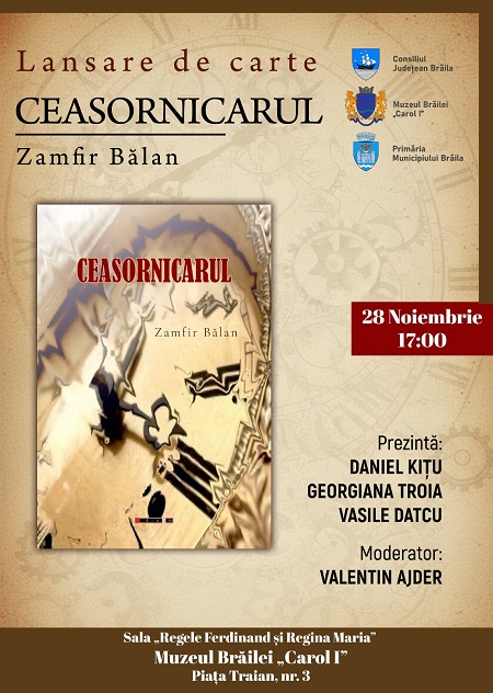 Muzeul Brăilei „Carol I” găzduiește un eveniment cultural de marcă: lansarea noului volum de povestiri intitulat „Ceasornicarul”, semnat de scriitorul Zamfir Bălan. Cartea a fost publicată sub egida Editurii Eikon. Evenimentul este programat pentru Vineri, 28 noiembrie 2025, de la ora 17:00, și se va desfășura în sala „Regele Ferdinand și Regina Maria”, situată la adresa Muzeului din Piața Traian, numărul 3.