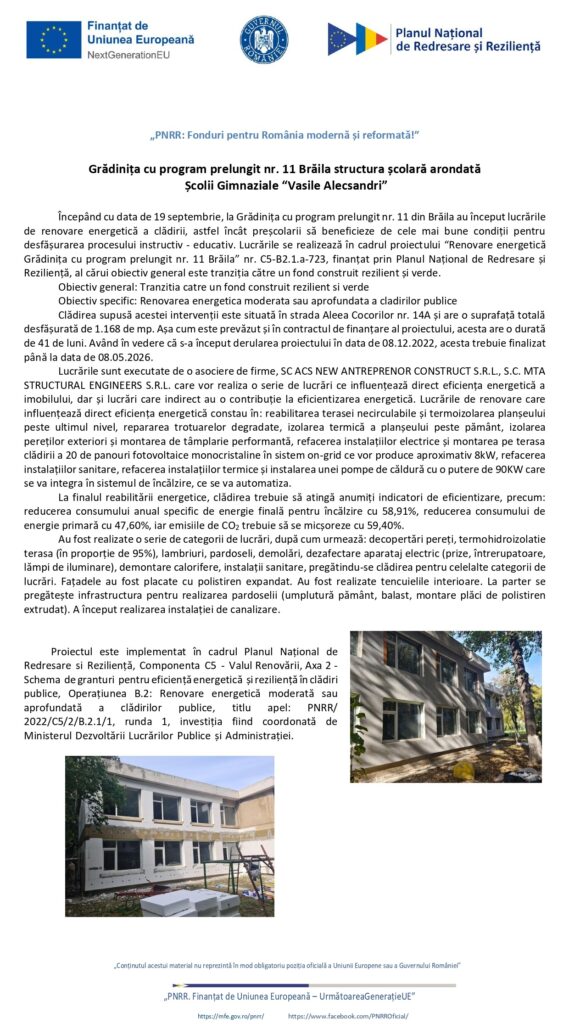 Grădinița cu program prelungit nr. 11 Brăila structura școlară arondată Școlii Gimnaziale “Vasile Alecsandri” – Renovare energetică