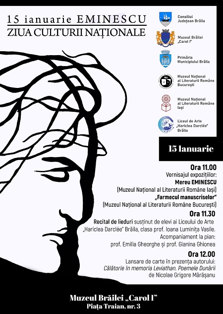 Muzeul Brăilei „Carol I” organizează joi, 15 ianuarie, începând cu ora 11.00, la sediul din Piața Traian, nr. 3, o serie de manifestări culturale dedicate Zilei Culturii Naționale și poetului Mihai Eminescu.