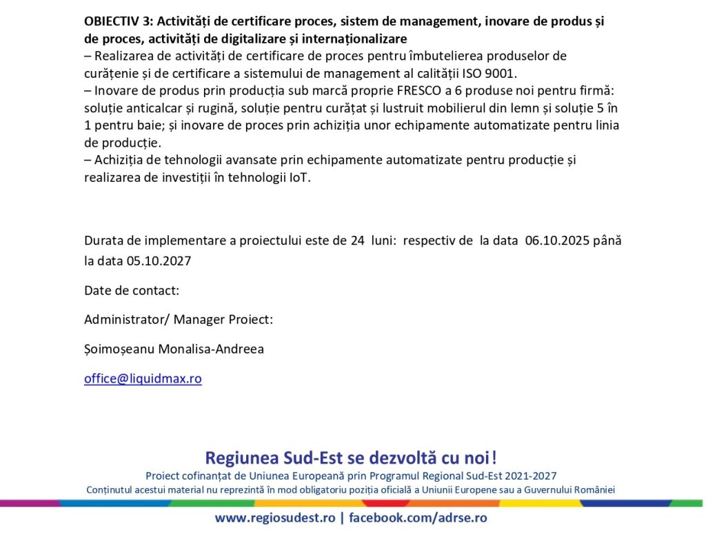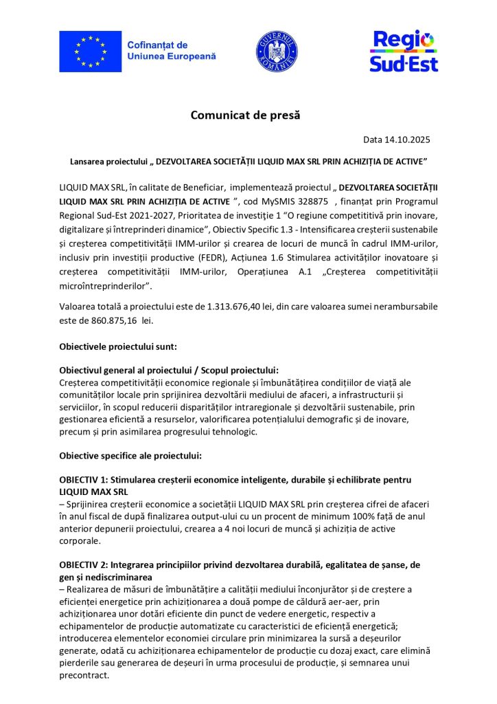 Lansarea proiectului „ DEZVOLTAREA SOCIETĂȚII LIQUID MAX SRL PRIN ACHIZIȚIA DE ACTIVE”