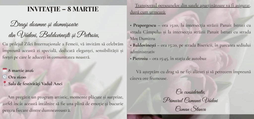 Primăria Comunei Vădeni invită comunitatea locală la un eveniment special de 8 Martie, organizat la Sala de festivități „Vadul Anei”. Autoritățile locale pun la dispoziție transport gratuit pentru cetățenii din satele aparținătoare.