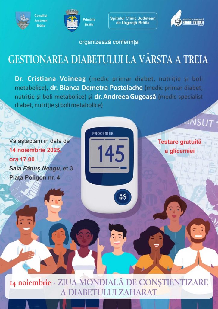 Cu prilejul Zilei Mondiale de Conștientizare a Diabetului, marcată anual pe 14 noiembrie, publicul brăilean este invitat să participe la un eveniment dedicat cunoașterii și educației medicale. Este vorba despre Conferința „Gestionarea diabetului la vârsta a treia”, un subiect de o importanță majoră, având în vedere creșterea speranței de viață.